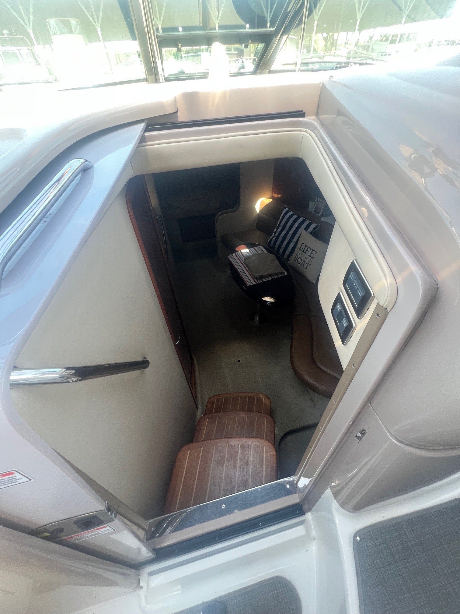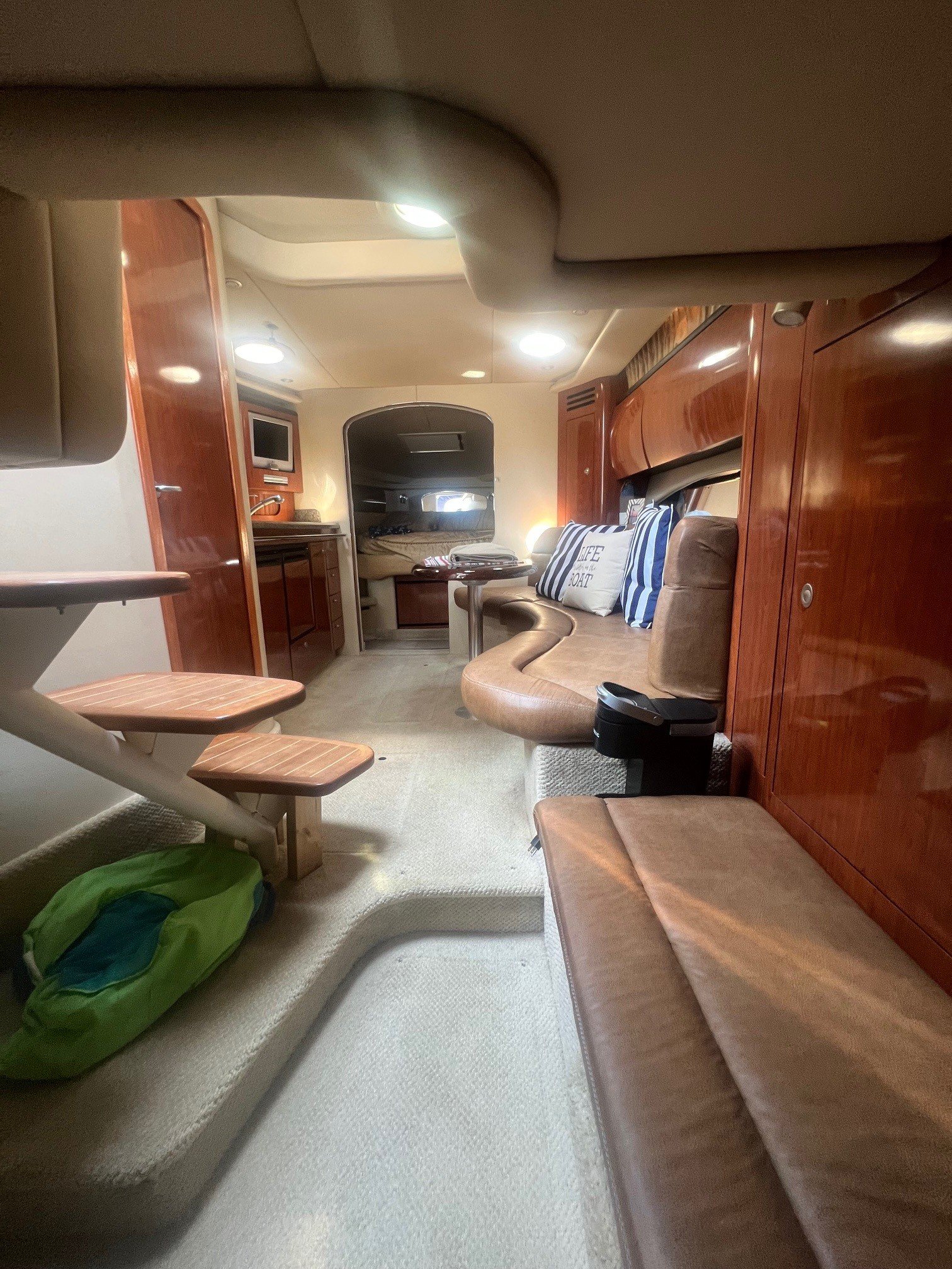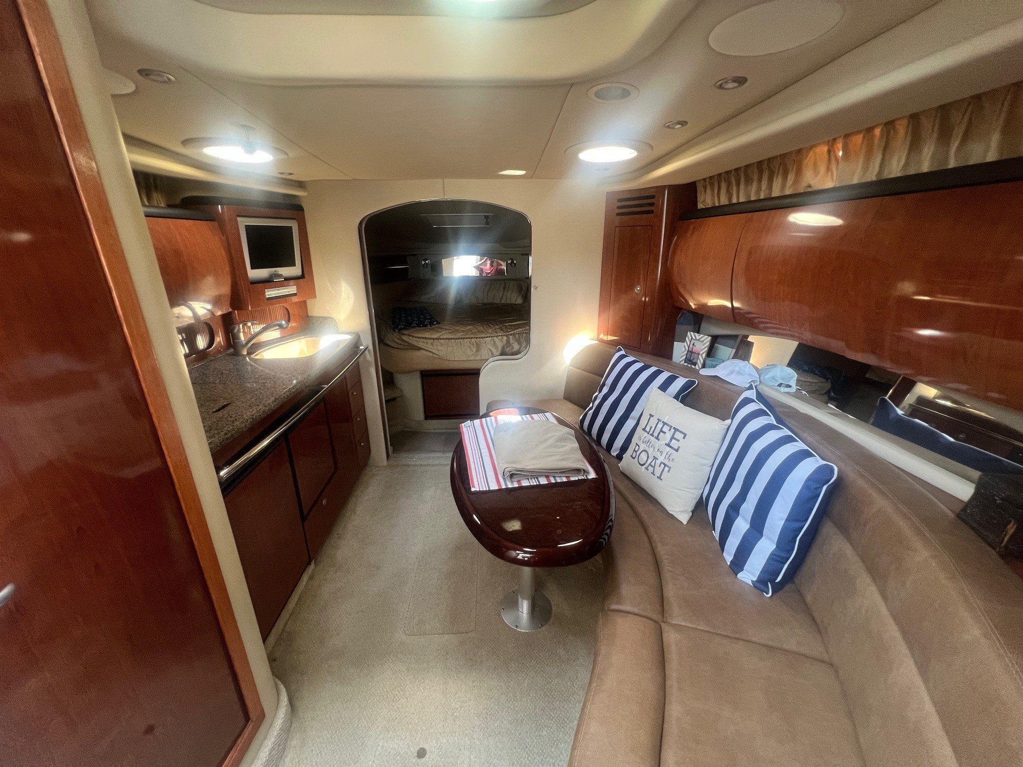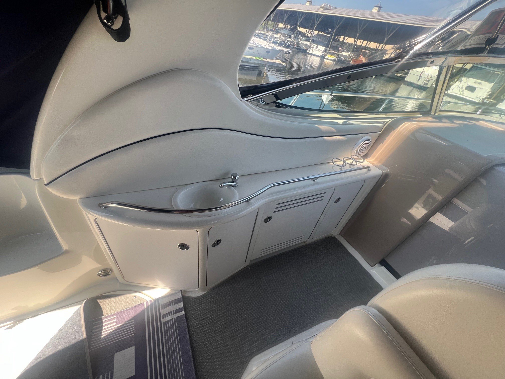 Built on a deep-V hull with moderate beam, the Sundancer’s midcabin interior gets high marks for its quality furnishings and fixtures. This is a comfortable layout with plenty of storage, a built-in entertainment center, a plush Ultraleather lounge, and excellent headroom. A two-part pocket door provides privacy for the forward stateroom, and both the salon sofa and midcabin lounge convert easily into double berths. At the helm, a bucket seat with a flip-up bolster allows for standup driving and there’s space in the tiered, burled dash for electronics. Engine access is excellent; the entire cockpit floor rises on hydraulic rams to completely expose the motors and V-drives. Additional features include an extended swim platform, an underwater exhaust system, a transom storage locker, and a cockpit wet bar. MerCruiser 8.1-liter 370hp V-drive gas engines will cruise the 360 Sundancer at 18 knots and reach a top speed of 30+ knots