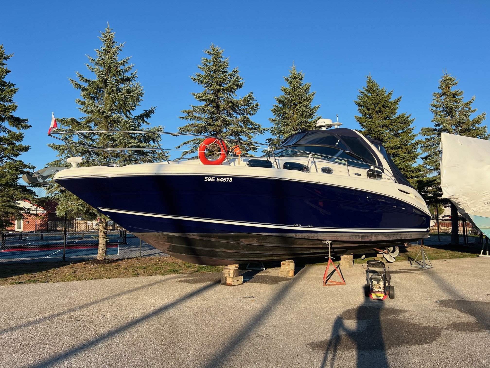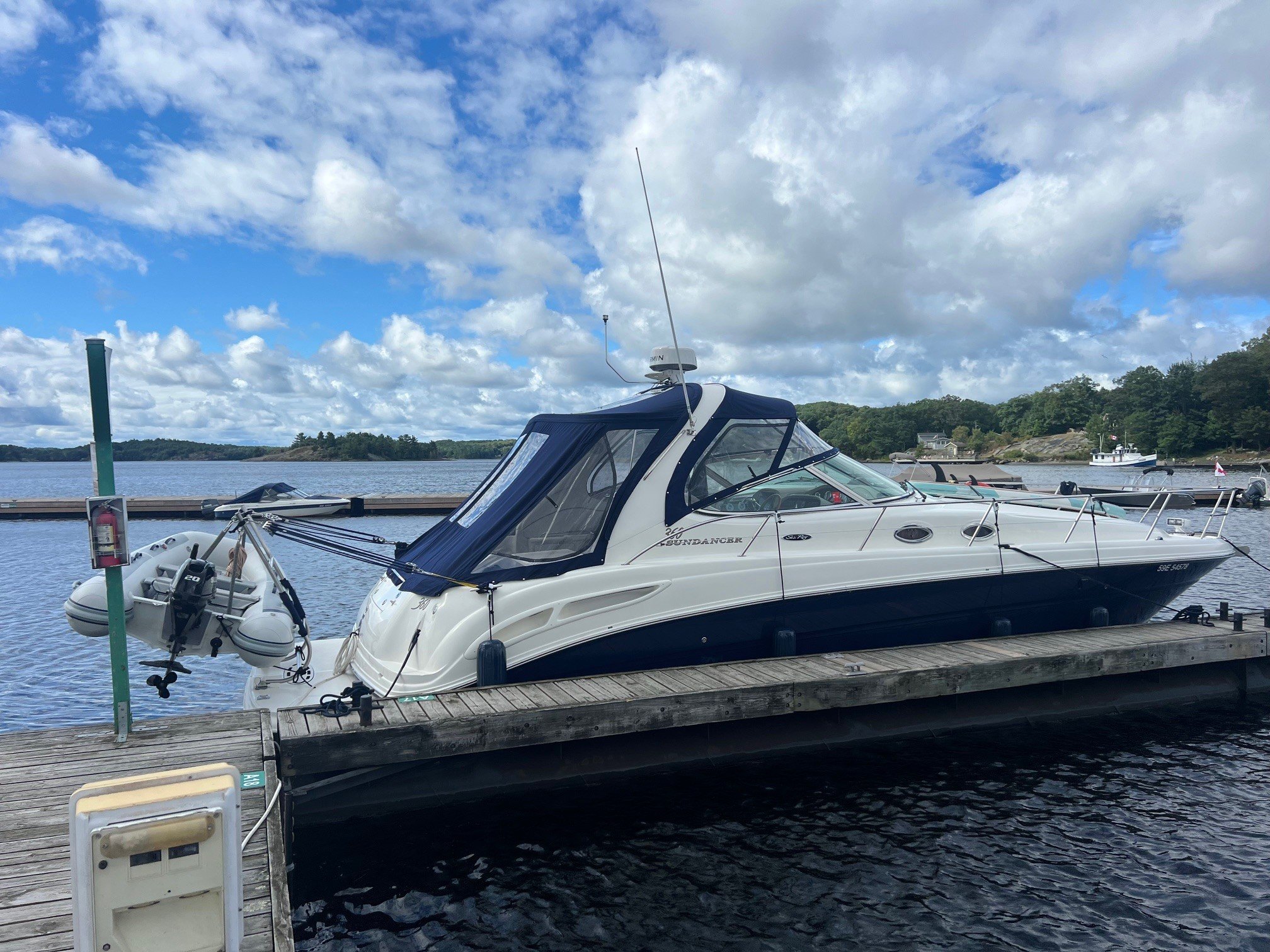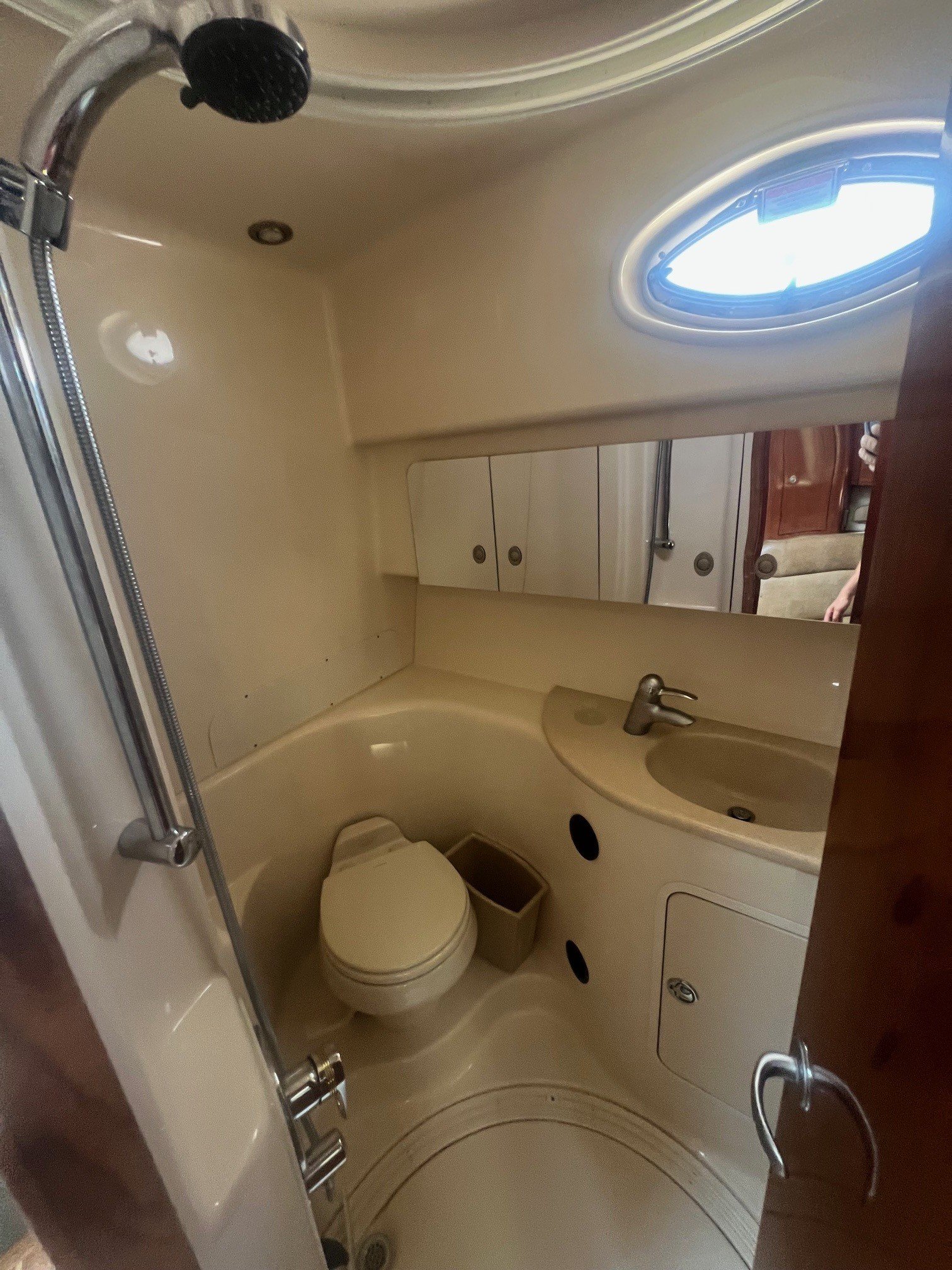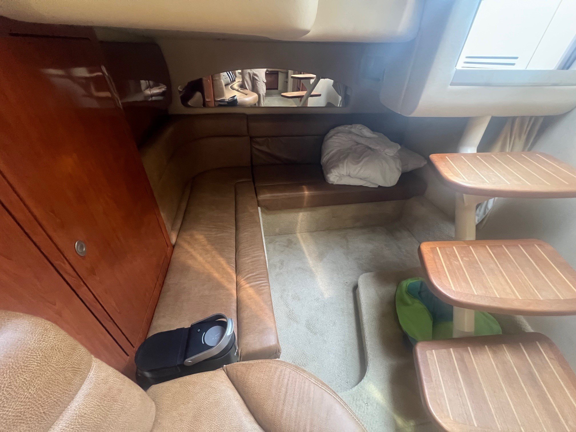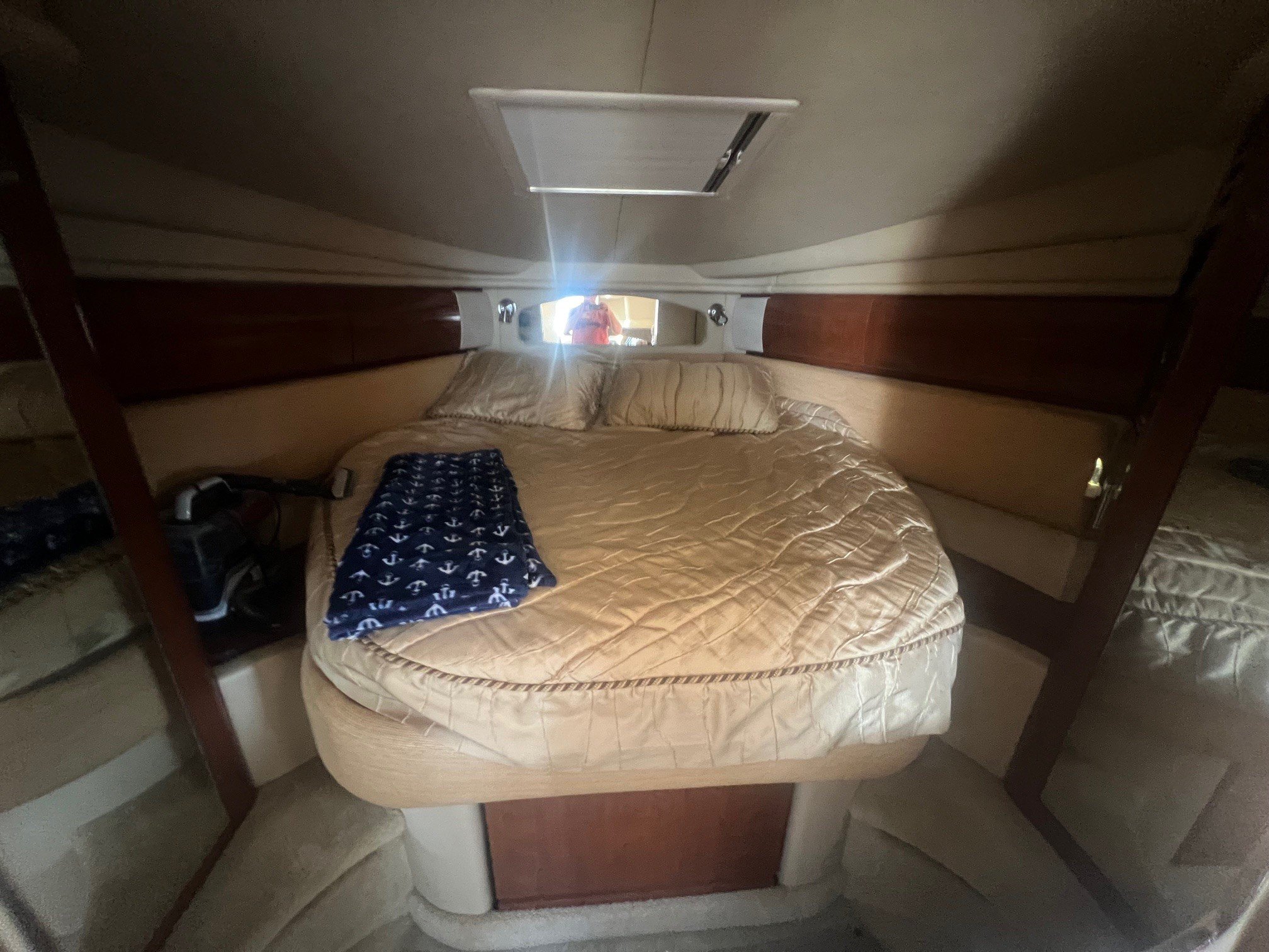 Built on a deep-V hull with moderate beam, the Sundancer’s midcabin interior gets high marks for its quality furnishings and fixtures. This is a comfortable layout with plenty of storage, a built-in entertainment center, a plush Ultraleather lounge, and excellent headroom. A two-part pocket door provides privacy for the forward stateroom, and both the salon sofa and midcabin lounge convert easily into double berths. At the helm, a bucket seat with a flip-up bolster allows for standup driving and there’s space in the tiered, burled dash for electronics. Engine access is excellent; the entire cockpit floor rises on hydraulic rams to completely expose the motors and V-drives. Additional features include an extended swim platform, an underwater exhaust system, a transom storage locker, and a cockpit wet bar. MerCruiser 8.1-liter 370hp V-drive gas engines will cruise the 360 Sundancer at 18 knots and reach a top speed of 30+ knots