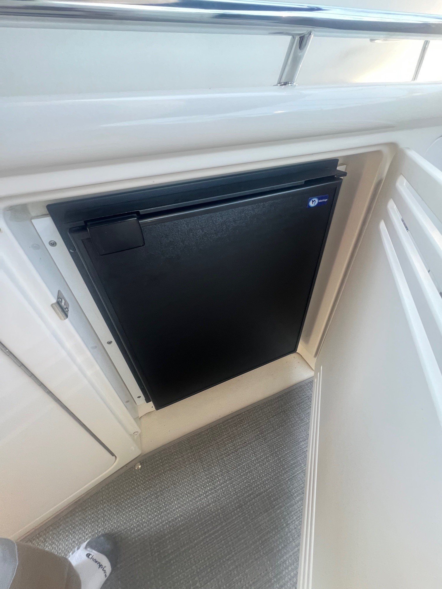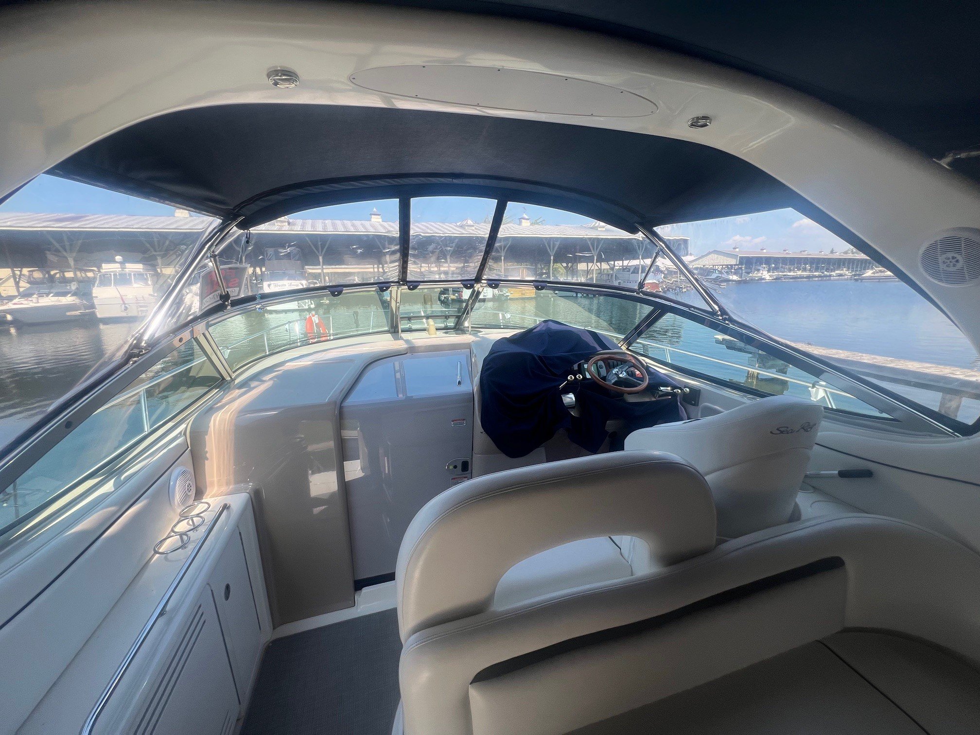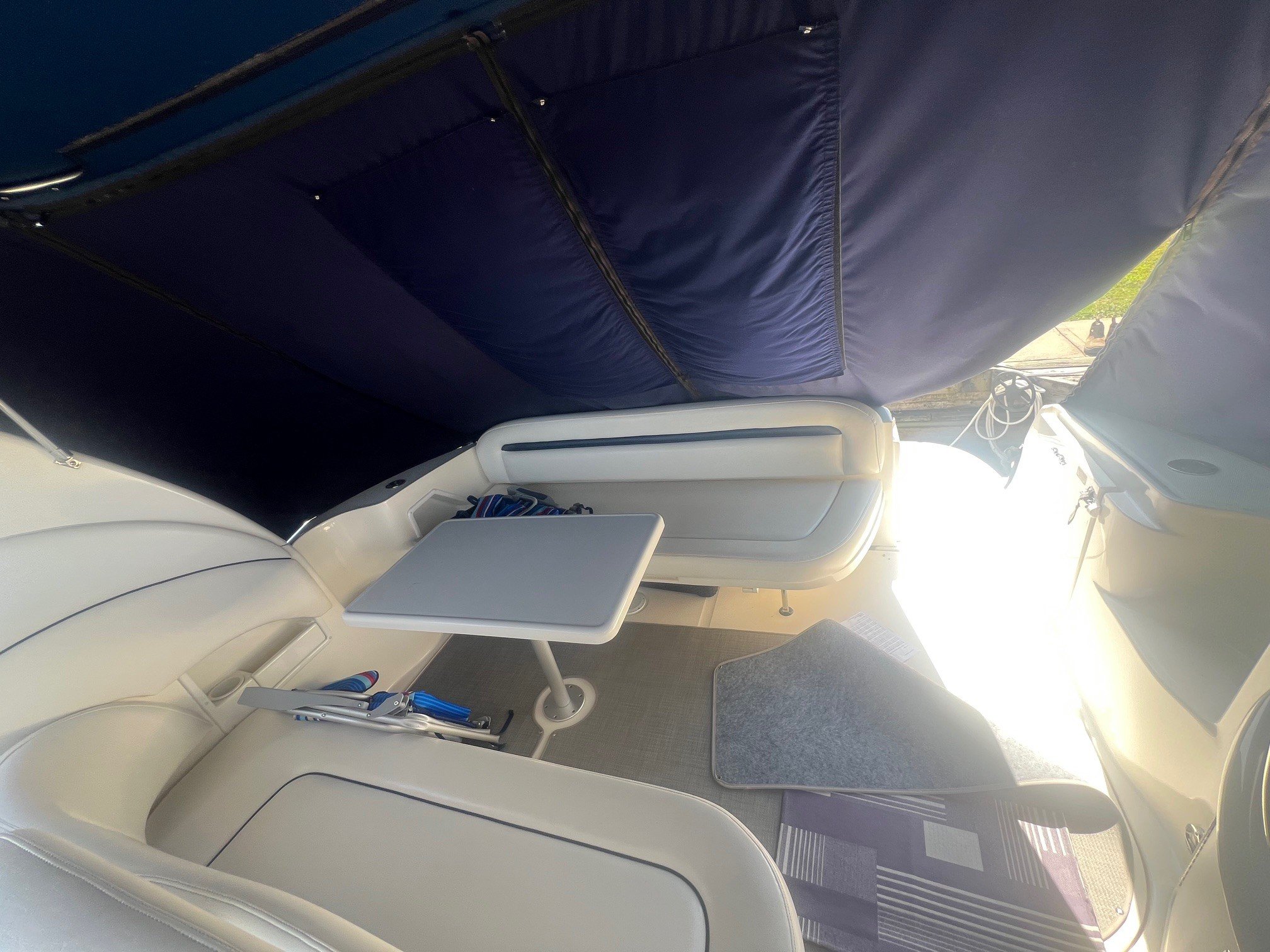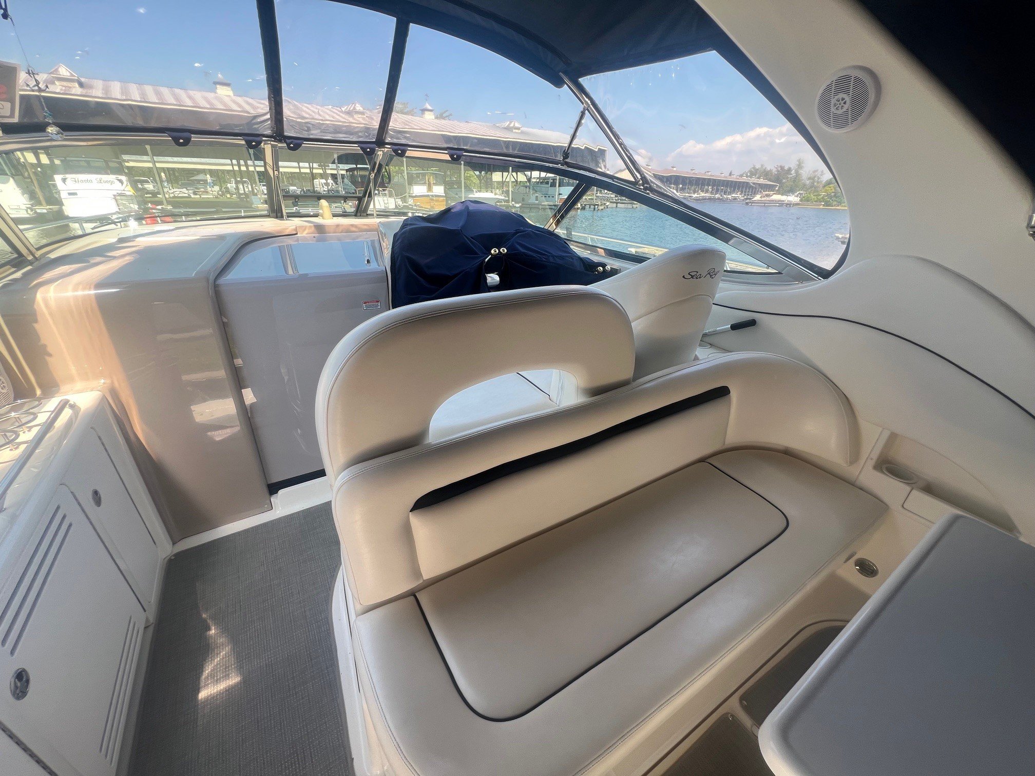 Built on a deep-V hull with moderate beam, the Sundancer’s midcabin interior gets high marks for its quality furnishings and fixtures. This is a comfortable layout with plenty of storage, a built-in entertainment center, a plush Ultraleather lounge, and excellent headroom. A two-part pocket door provides privacy for the forward stateroom, and both the salon sofa and midcabin lounge convert easily into double berths. At the helm, a bucket seat with a flip-up bolster allows for standup driving and there’s space in the tiered, burled dash for electronics. Engine access is excellent; the entire cockpit floor rises on hydraulic rams to completely expose the motors and V-drives. Additional features include an extended swim platform, an underwater exhaust system, a transom storage locker, and a cockpit wet bar. MerCruiser 8.1-liter 370hp V-drive gas engines will cruise the 360 Sundancer at 18 knots and reach a top speed of 30+ knots
