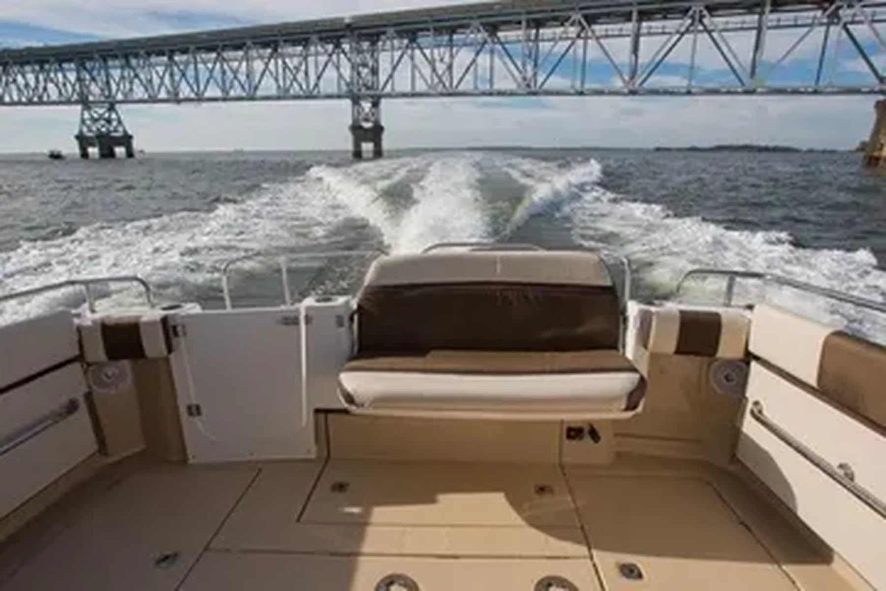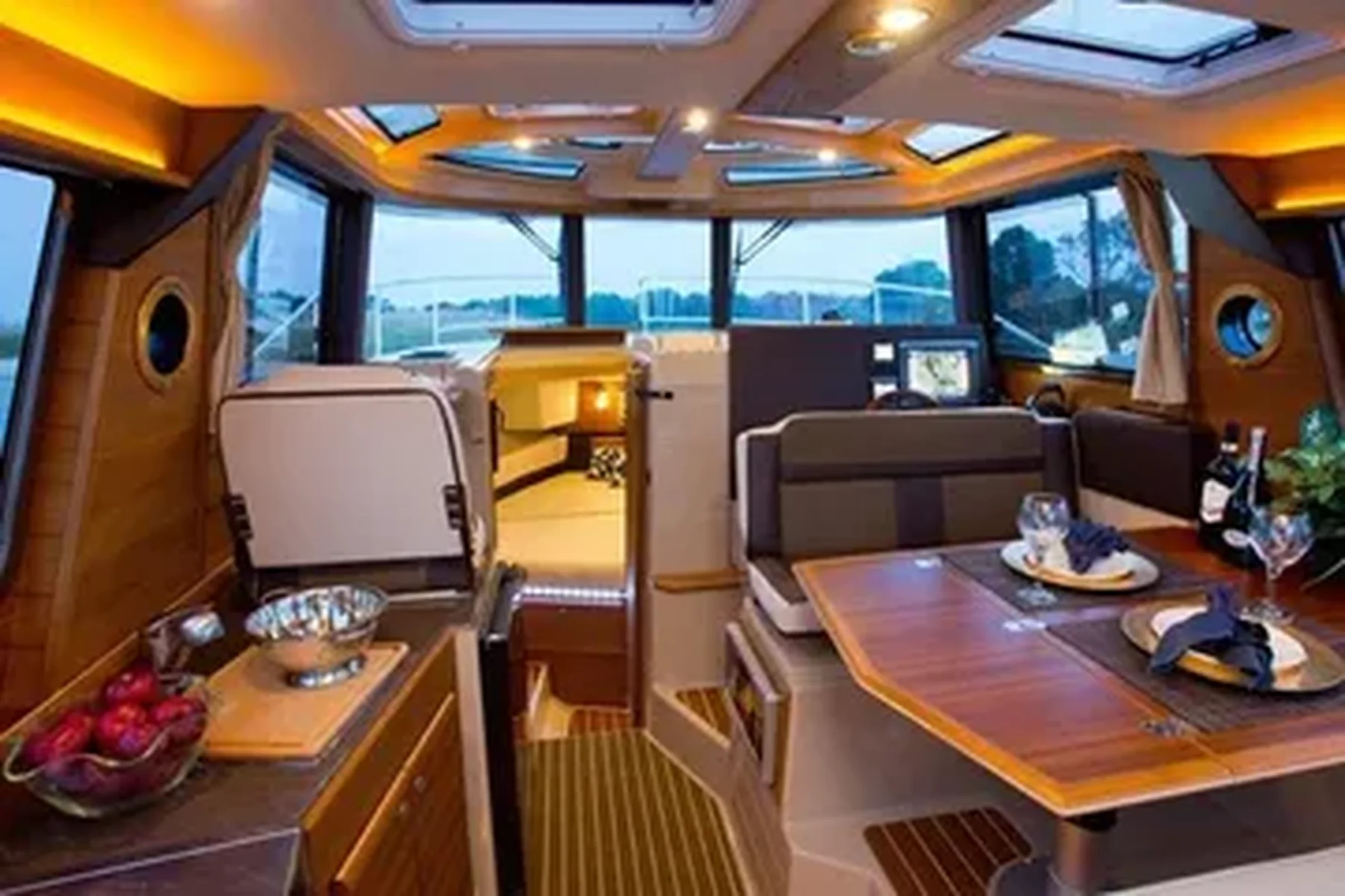 The Ranger Tugs R-29 S (Sedan) is another masterpiece of innovation. The contemporary styling features a curved front window and an overhead glass atrium that provides exceptional visibility from the helm station and salon area. An ingenious aft cockpit seating arrangement includes a reversible seat, port and starboard jump seats and a teak table for outside dining. The opening cabin bulkhead with reversible seat provides additional cockpit seating while bringing the outside-in.