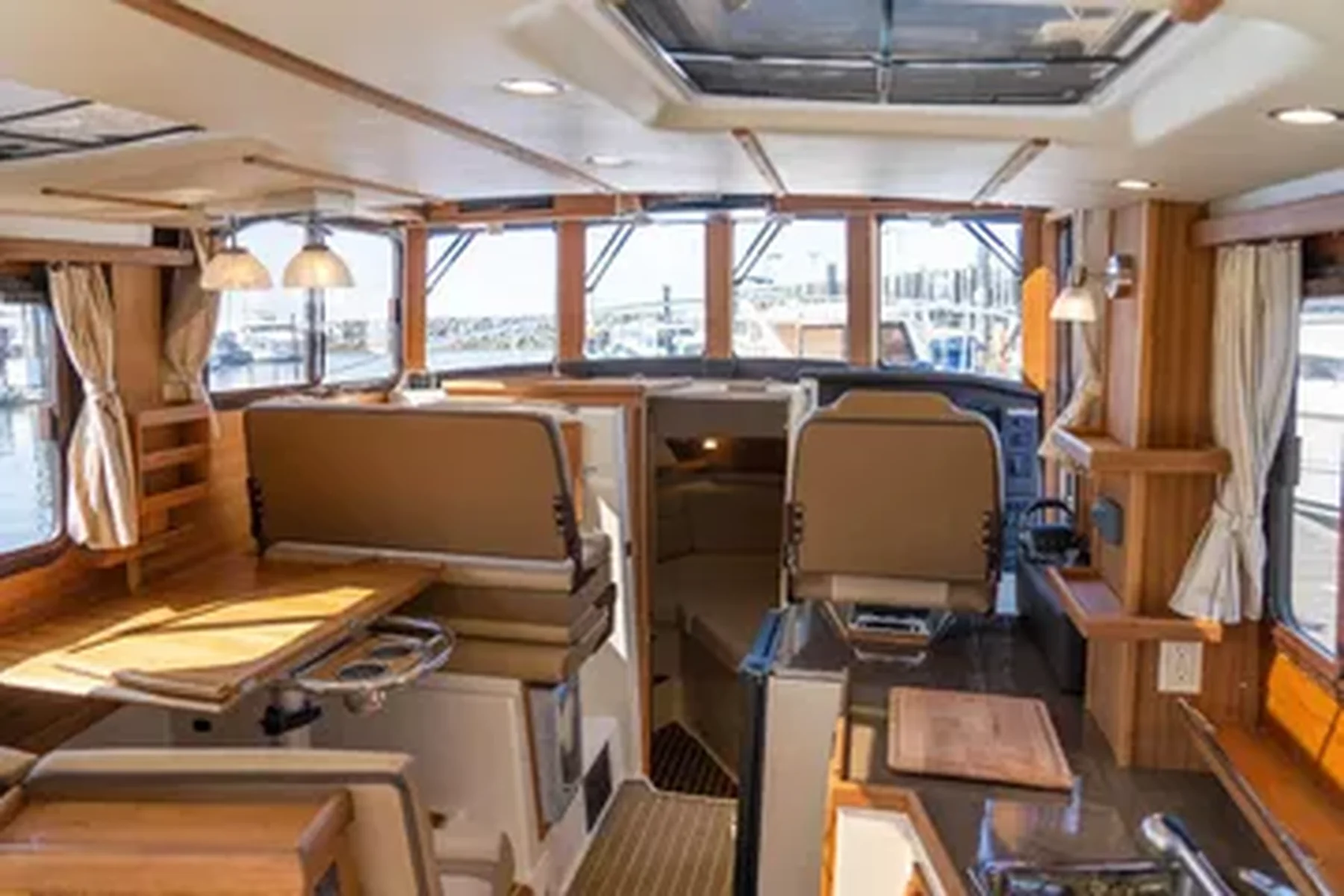 The interior layout of the R-31S features two staterooms—one large island berth forward with en suite head and a midship berth and day head. Those who are familiar with Ranger Tugs models will recognize the galley layout and helm station that maximize interior space. A starboard side door provides easy access from the helm to the side decks so crew can get to the bow for line handling.